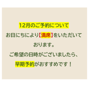 2025/11/08 いつもヘアーエステサロンyakへご来店頂きましてありがとうございます。 ◆+ 。。+◇+ 。。+◆+ 。。+◇+ 。。+◆+ 。。+◇ 12月のご予約がお日にちによって満席の日もできております。 12月は30日(火)まで営業しております。 お日にちお決まりのお客様は早めの ご予約がおすすめです。 24時間対応のWeb予約や、アプリ予約をご活用ください❣️ ◆+ 。。+◇+ 。。+◆+ 。。+◇+ 。。+◆+ 。。+◇ 【ヘアーエステ専門店】yak